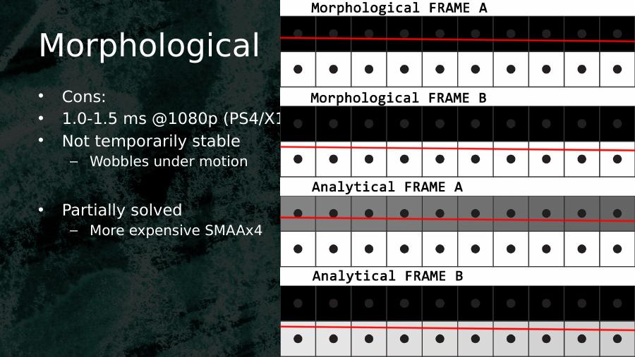 Morphological• Cons:• 1.0-1.5 ms @1080p (PS4/X1)• Not temporarily stable– Wobbles under motion• Partially solved– More expensive SMAAx4