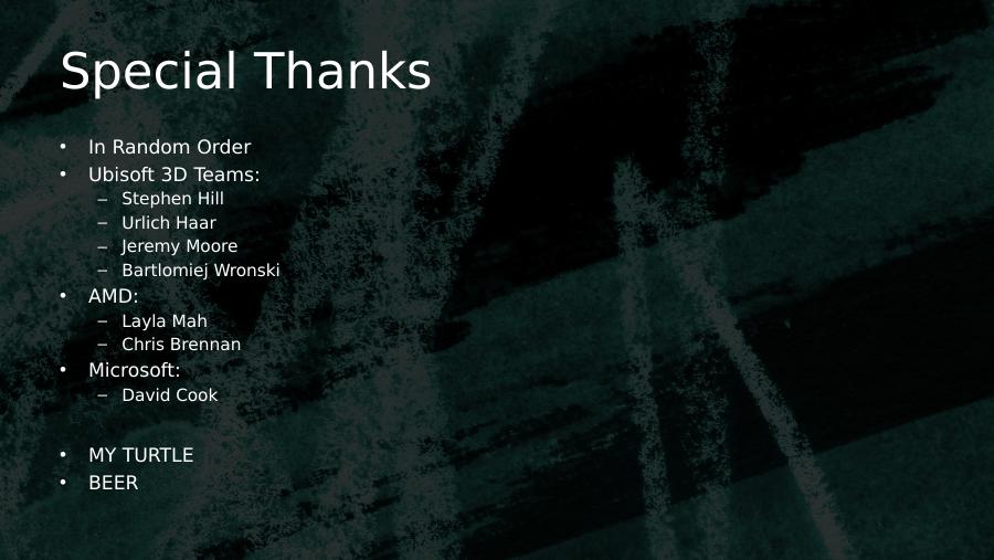 Special Thanks• In Random Order• Ubisoft 3D Teams:– Stephen Hill– Urlich Haar– Jeremy Moore– Bartlomiej Wronski• AMD:– Layla Mah– Chris Brennan• Microsoft:– David Cook• MY TURTLE• BEER
