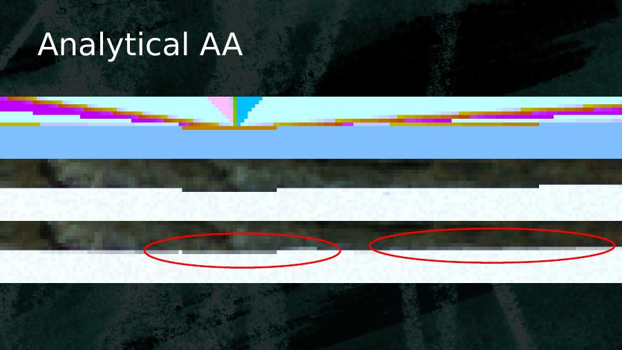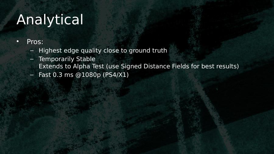 Analytical• Pros:– Highest edge quality close to ground truth– Temporarily StableExtends to Alpha Test (use Signed Distance Fields for best results)– Fast 0.3 ms @1080p (PS4/X1)