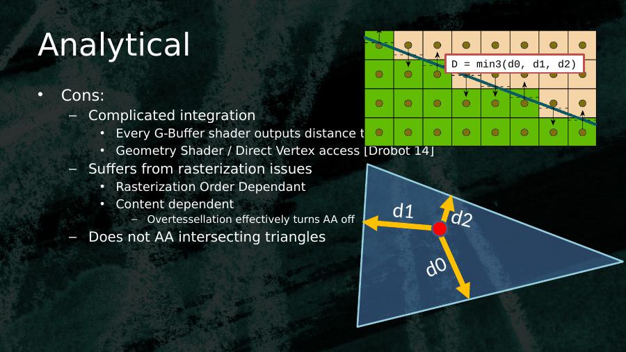 Analytical• Cons:– Complicated integration• Every G-Buffer shader outputs distance to edge• Geometry Shader / Direct Vertex access [Drobot 14]– Suffers from rasterization issues• Rasterization Order Dependant• Content dependent– Overtessellation effectively turns AA off– Does not AA intersecting trianglesd0d1 d2D = min3(d0, d1, d2)