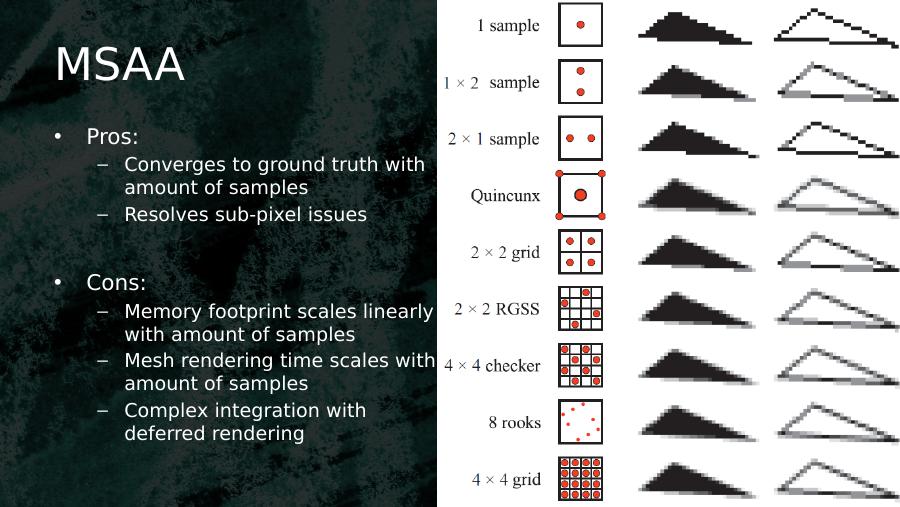 MSAA• Pros:– Converges to ground truth with amount of samples– Resolves sub-pixel issues• Cons:– Memory footprint scales linearly with amount of samples– Mesh rendering time scales with amount of samples– Complex integration with deferred rendering