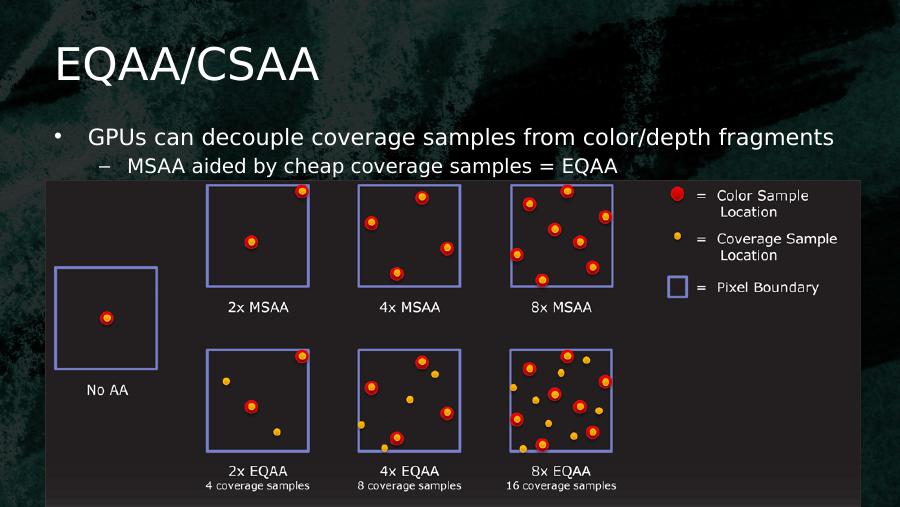 EQAA/CSAA• GPUs can decouple coverage samples from color/depth fragments– MSAA aided by cheap coverage samples = EQAA
