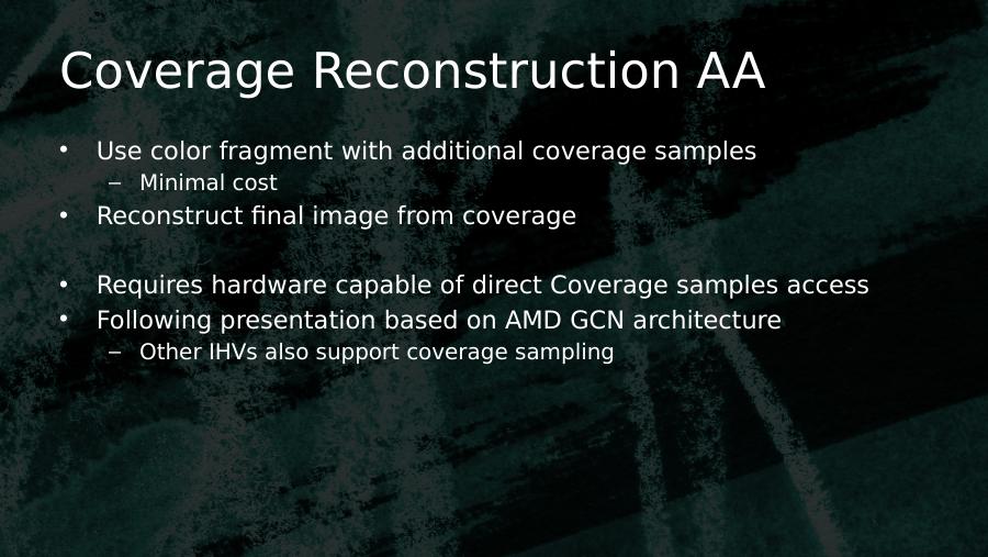 Coverage Reconstruction AA• Use color fragment with additional coverage samples– Minimal cost• Reconstruct final image from coverage• Requires hardware capable of direct Coverage samples access• Following presentation based on AMD GCN architecture– Other IHVs also support coverage sampling