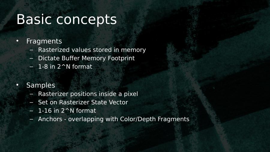 Basic concepts• Fragments– Rasterized values stored in memory– Dictate Buffer Memory Footprint– 1-8 in 2^N format• Samples– Rasterizer positions inside a pixel– Set on Rasterizer State Vector– 1-16 in 2^N format– Anchors - overlapping with Color/Depth Fragments