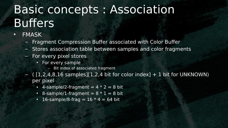 Basic concepts : Association Buffers• FMASK– Fragment Compression Buffer associated with Color Buffer– Stores association table between samples and color fragments– For every pixel stores• For every sample– Bit index of associated fragment– ( [1,2,4,8,16 samples][1,2,4 bit for color index] + 1 bit for UNKNOWN) per pixel• 4-sample/2-fragment = 4 * 2 = 8 bit• 8-sample/1-fragment = 8 * 1 = 8 bit• 16-sample/8-frag = 16 * 4 = 64 bit