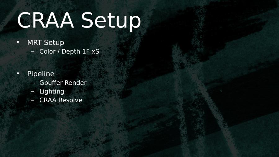 CRAA Setup• MRT Setup– Color / Depth 1F xS• Pipeline– Gbuffer Render– Lighting– CRAA Resolve