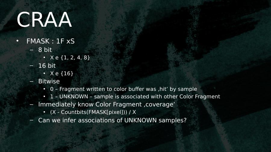 CRAA• FMASK : 1F xS– 8 bit• X e {1, 2, 4, 8}– 16 bit• X e {16}– Bitwise• 0 – Fragment written to color buffer was ‚hit’ by sample• 1 – UNKNOWN – sample is associated with other Color Fragment– Immediately know Color Fragment ‚coverage’• (X - Countbits(FMASK[pixel])) / X– Can we infer associations of UNKNOWN samples?