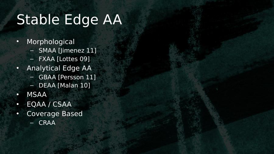 Stable Edge AA• Morphological– SMAA [Jimenez 11]– FXAA [Lottes 09]• Analytical Edge AA– GBAA [Persson 11]– DEAA [Malan 10]• MSAA• EQAA / CSAA• Coverage Based– CRAA
