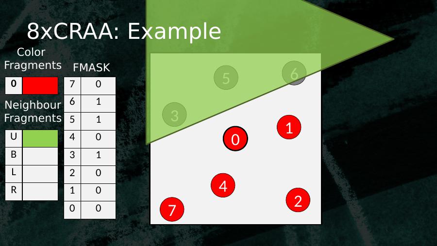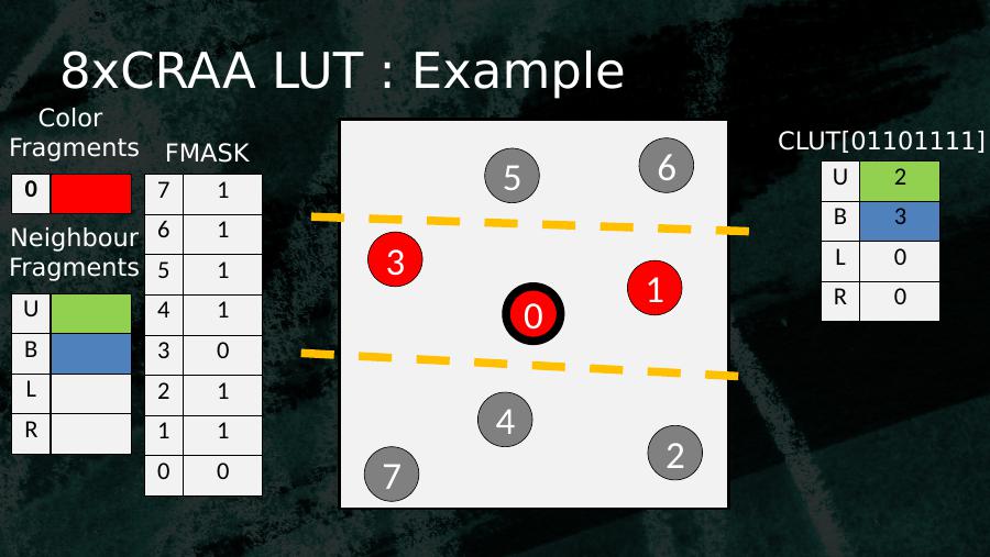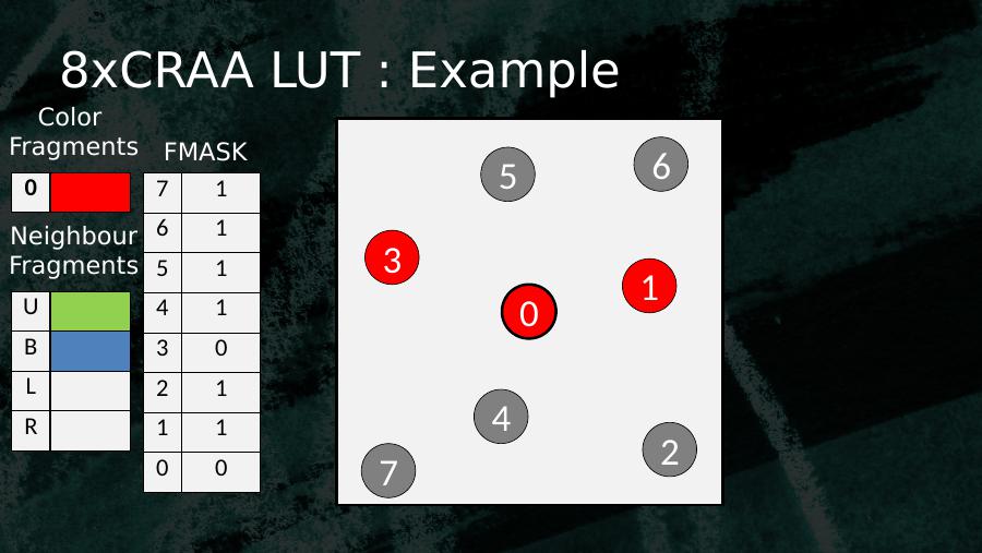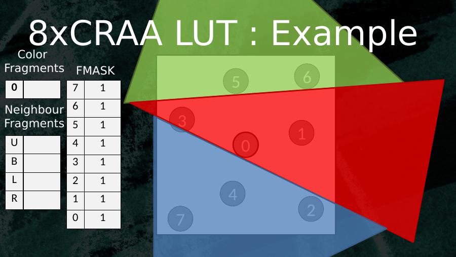 053614270 7 16 15 14 13 02 11 10 0Color Fragments FMASKUBLRNeighbourFragments8xCRAA LUT : Example