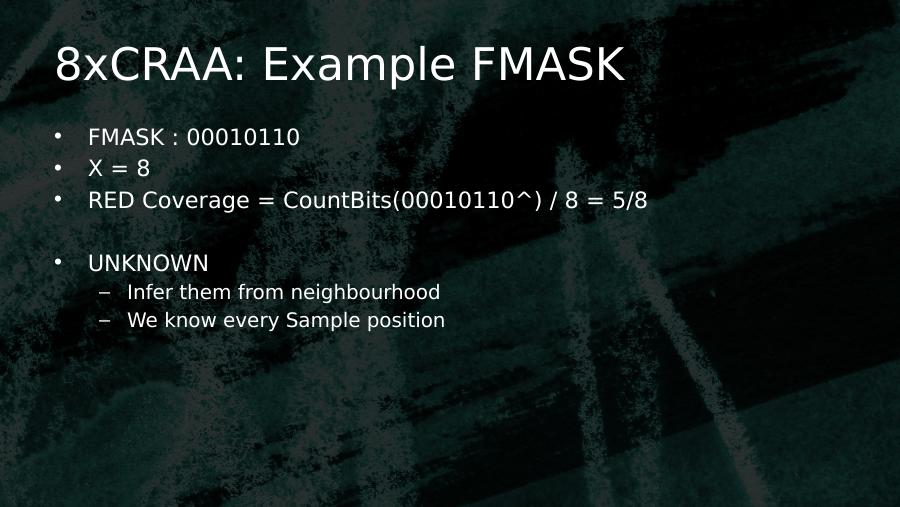 • FMASK : 00010110• X = 8• RED Coverage = CountBits(00010110^) / 8 = 5/8• UNKNOWN– Infer them from neighbourhood– We know every Sample position8xCRAA: Example FMASK