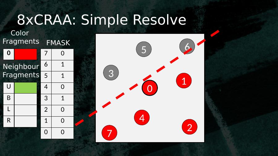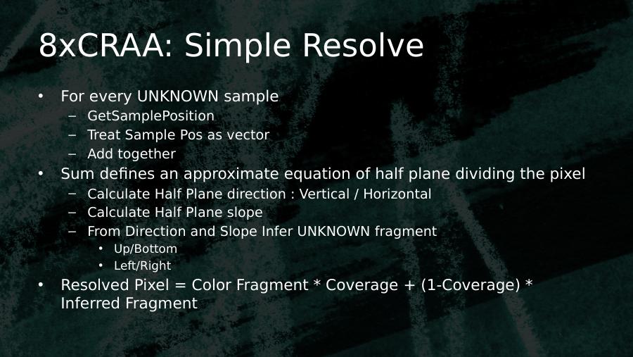 8xCRAA: Simple Resolve• For every UNKNOWN sample– GetSamplePosition– Treat Sample Pos as vector– Add together• Sum defines an approximate equation of half plane dividing the pixel– Calculate Half Plane direction : Vertical / Horizontal– Calculate Half Plane slope– From Direction and Slope Infer UNKNOWN fragment• Up/Bottom• Left/Right• Resolved Pixel = Color Fragment * Coverage + (1-Coverage) * Inferred Fragment