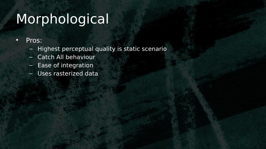 Morphological• Pros:– Highest perceptual quality is static scenario– Catch All behaviour– Ease of integration– Uses rasterized data