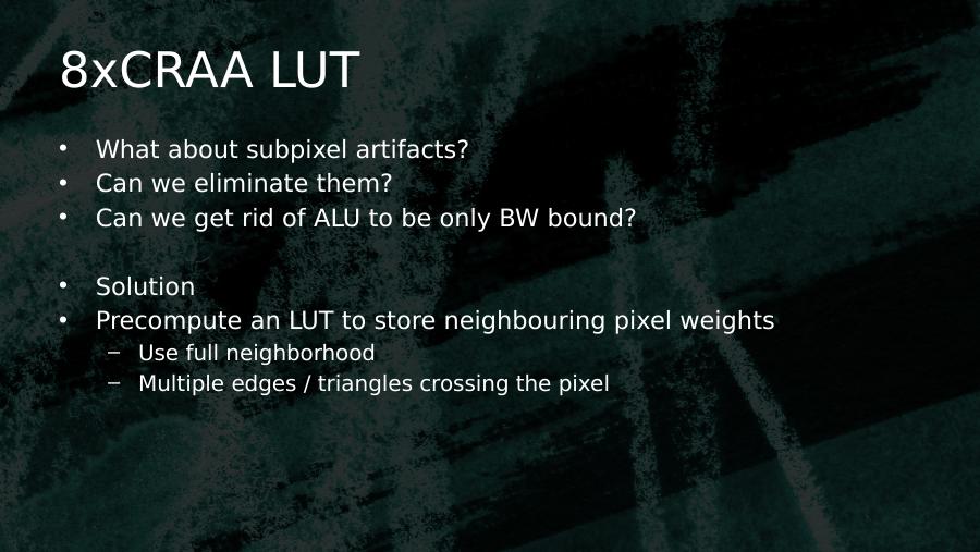 8xCRAA LUT• What about subpixel artifacts?• Can we eliminate them?• Can we get rid of ALU to be only BW bound?• Solution• Precompute an LUT to store neighbouring pixel weights– Use full neighborhood– Multiple edges / triangles crossing the pixel