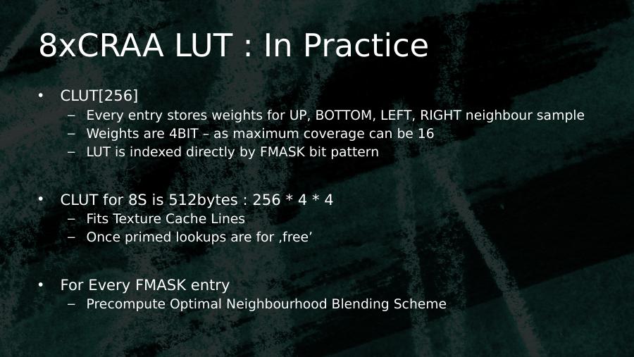 8xCRAA LUT : In Practice• CLUT[256]– Every entry stores weights for UP, BOTTOM, LEFT, RIGHT neighbour sample– Weights are 4BIT – as maximum coverage can be 16– LUT is indexed directly by FMASK bit pattern• CLUT for 8S is 512bytes : 256 * 4 * 4 – Fits Texture Cache Lines– Once primed lookups are for ‚free’• For Every FMASK entry – Precompute Optimal Neighbourhood Blending Scheme