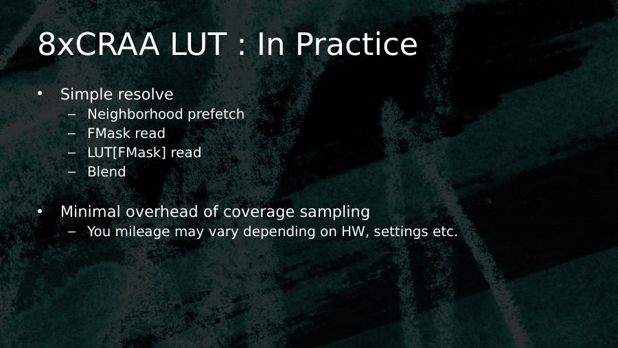 8xCRAA LUT : In Practice• Simple resolve– Neighborhood prefetch– FMask read– LUT[FMask] read– Blend• Minimal overhead of coverage sampling– You mileage may vary depending on HW, settings etc.