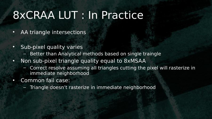 8xCRAA LUT : In Practice• AA triangle intersections• Sub-pixel quality varies– Better than Analytical methods based on single traingle• Non sub-pixel triangle quality equal to 8xMSAA– Correct resolve assuming all triangles cutting the pixel will rasterize in immediate neighborhood• Common fail case:– Triangle doesn’t rasterize in immediate neighborhood