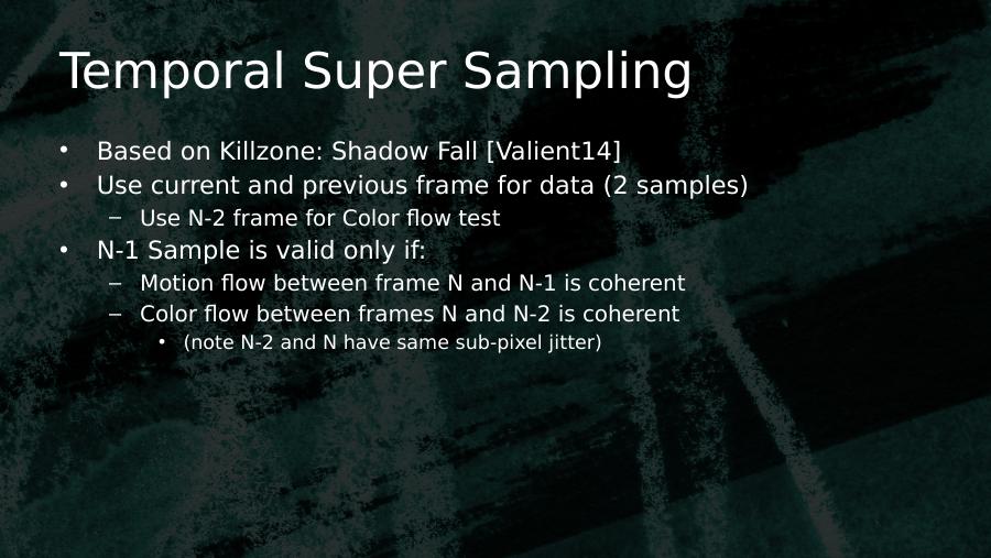 Temporal Super Sampling• Based on Killzone: Shadow Fall [Valient14]• Use current and previous frame for data (2 samples) – Use N-2 frame for Color flow test• N-1 Sample is valid only if:– Motion flow between frame N and N-1 is coherent– Color flow between frames N and N-2 is coherent• (note N-2 and N have same sub-pixel jitter)