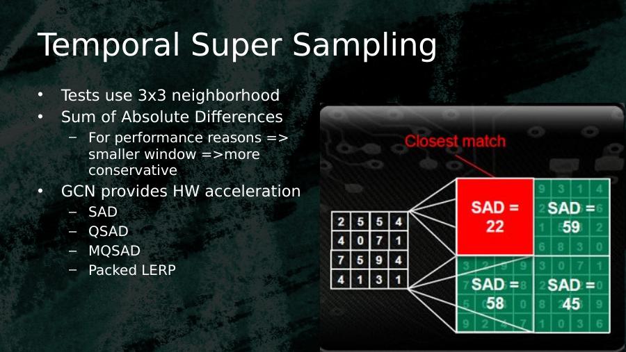 Temporal Super Sampling• Tests use 3x3 neighborhood • Sum of Absolute Differences– For performance reasons => smaller window =>more conservative• GCN provides HW acceleration– SAD– QSAD– MQSAD– Packed LERP