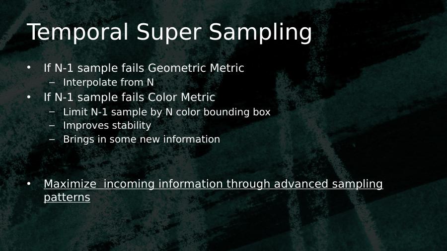 Temporal Super Sampling• If N-1 sample fails Geometric Metric– Interpolate from N• If N-1 sample fails Color Metric– Limit N-1 sample by N color bounding box– Improves stability– Brings in some new information• Maximize incoming information through advanced sampling patterns