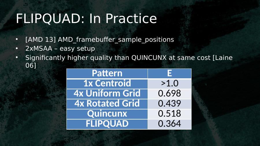 FLIPQUAD: In Practice• [AMD 13] AMD_framebuffer_sample_positions• 2xMSAA – easy setup• Significantly higher quality than QUINCUNX at same cost [Laine 06]Pattern E1x Centroid >1.04x Uniform Grid 0.6984x Rotated Grid 0.439Quincunx 0.518FLIPQUAD 0.364