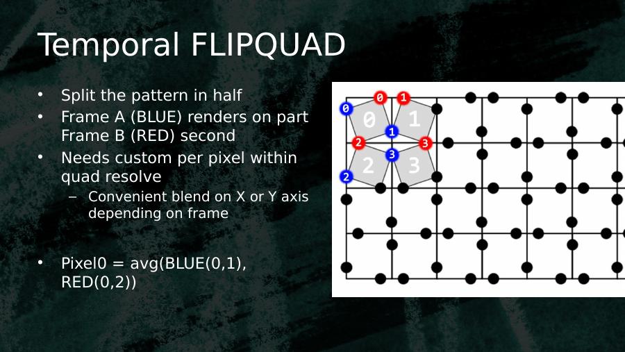 Temporal FLIPQUAD• Split the pattern in half• Frame A (BLUE) renders on part Frame B (RED) second• Needs custom per pixel within quad resolve– Convenient blend on X or Y axis depending on frame• Pixel0 = avg(BLUE(0,1), RED(0,2))