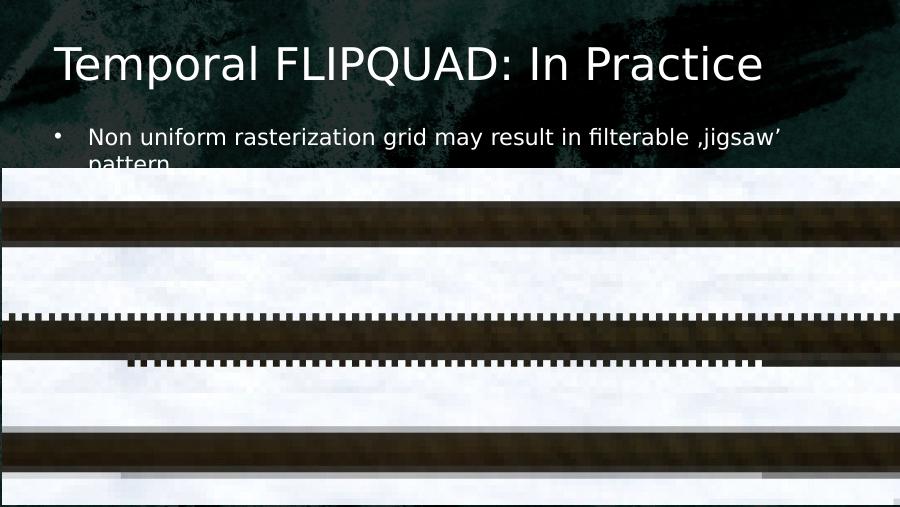 Temporal FLIPQUAD: In Practice• Non uniform rasterization grid may result in filterable ‚jigsaw’ pattern