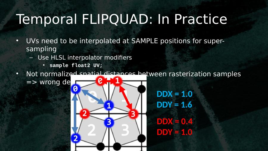 Temporal FLIPQUAD: In Practice• UVs need to be interpolated at SAMPLE positions for super-sampling– Use HLSL interpolator modifiers• sample float2 UV;• Not normalized spatial distances between rasterization samples => wrong derivative calculationDDX = 1.0DDY = 1.6DDX = 0.4DDY = 1.0