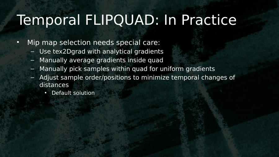 Temporal FLIPQUAD: In Practice• Mip map selection needs special care:– Use tex2Dgrad with analytical gradients– Manually average gradients inside quad– Manually pick samples within quad for uniform gradients– Adjust sample order/positions to minimize temporal changes of distances• Default solution