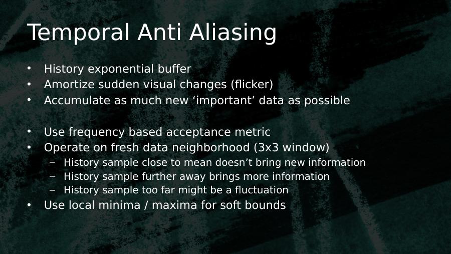 Temporal Anti Aliasing• History exponential buffer• Amortize sudden visual changes (flicker)• Accumulate as much new ‘important’ data as possible• Use frequency based acceptance metric• Operate on fresh data neighborhood (3x3 window)– History sample close to mean doesn’t bring new information– History sample further away brings more information– History sample too far might be a fluctuation• Use local minima / maxima for soft bounds