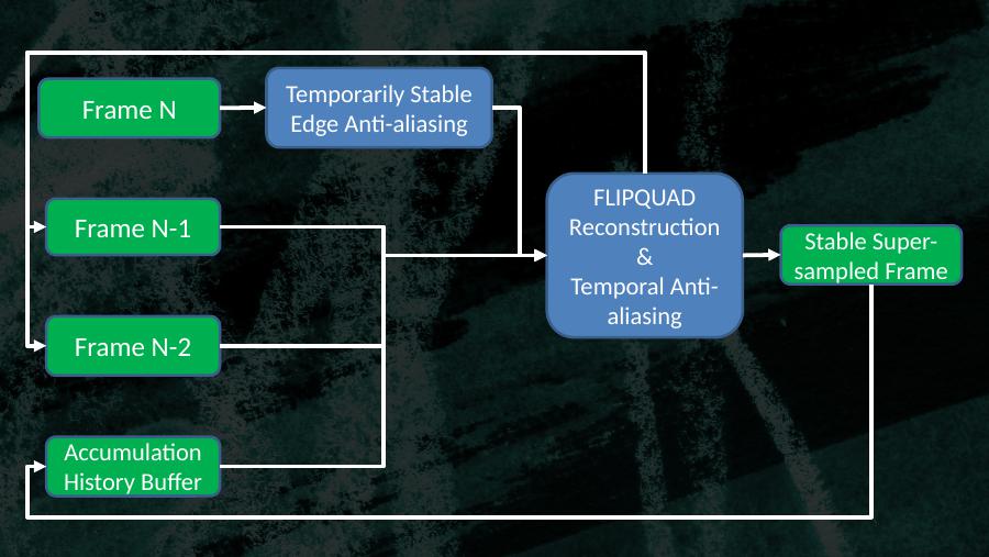 Frame NTemporarily StableEdge Anti-aliasingFLIPQUAD Reconstruction&Temporal Anti-aliasingFrame N-1Frame N-2Accumulation History BufferStable Super-sampled Frame