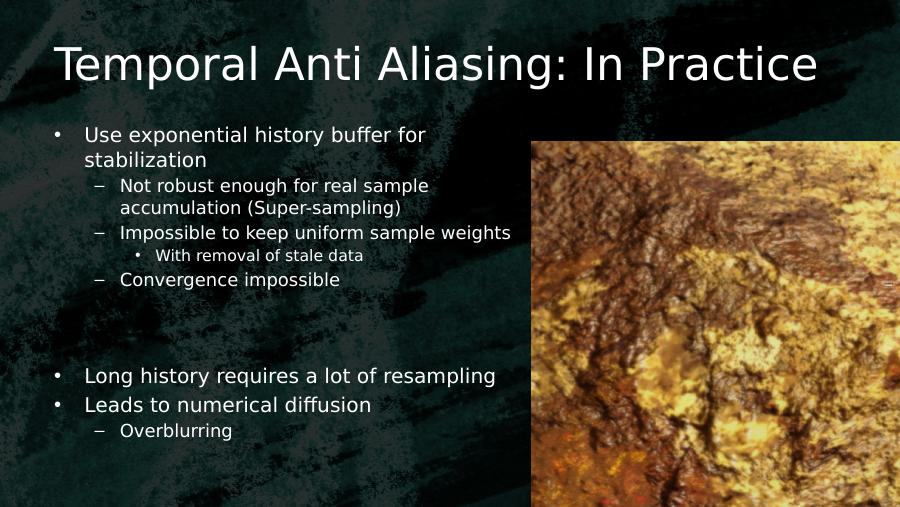 Temporal Anti Aliasing: In Practice• Use exponential history buffer for stabilization– Not robust enough for real sample accumulation (Super-sampling)– Impossible to keep uniform sample weights• With removal of stale data– Convergence impossible• Long history requires a lot of resampling• Leads to numerical diffusion– Overblurring