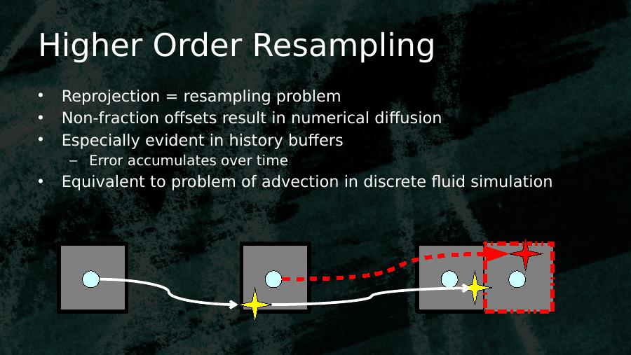 Higher Order Resampling• Reprojection = resampling problem• Non-fraction offsets result in numerical diffusion• Especially evident in history buffers– Error accumulates over time• Equivalent to problem of advection in discrete fluid simulation