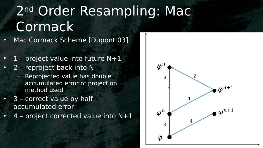 2nd Order Resampling: Mac Cormack• Mac Cormack Scheme [Dupont 03]• 1 – project value into future N+1• 2 – reproject back into N– Reprojected value has double accumulated error of projection method used• 3 – correct value by half accumulated error• 4 – project corrected value into N+1