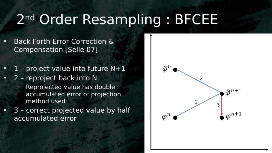 2nd Order Resampling : BFCEE• Back Forth Error Correction & Compensation [Selle 07]• 1 – project value into future N+1• 2 – reproject back into N– Reprojected value has double accumulated error of projection method used• 3 – correct projected value by half accumulated error