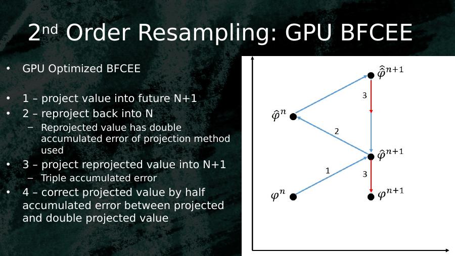 2nd Order Resampling: GPU BFCEE• GPU Optimized BFCEE• 1 – project value into future N+1• 2 – reproject back into N– Reprojected value has double accumulated error of projection method used• 3 – project reprojected value into N+1– Triple accumulated error• 4 – correct projected value by half accumulated error between projected and double projected value