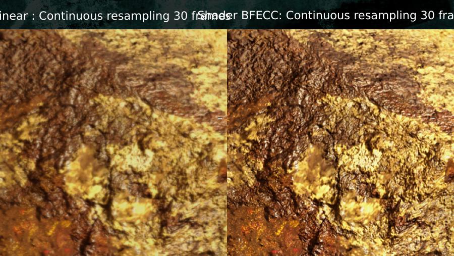 • Use per Sample interpolation mode – super-sampling on texture data• Not normalized spatial distances between rasterization samples => wrong derivative calculation• Mip map selection need special care– tex2Dgrad with analytical gradients• Set sample order to minimize temporal changes of distancesBilinear : Continuous resampling 30 framesShader BFECC: Continuous resampling 30 frames