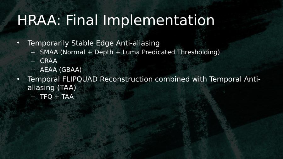 HRAA: Final Implementation• Temporarily Stable Edge Anti-aliasing– SMAA (Normal + Depth + Luma Predicated Thresholding)– CRAA– AEAA (GBAA)• Temporal FLIPQUAD Reconstruction combined with Temporal Anti-aliasing (TAA)– TFQ + TAA
