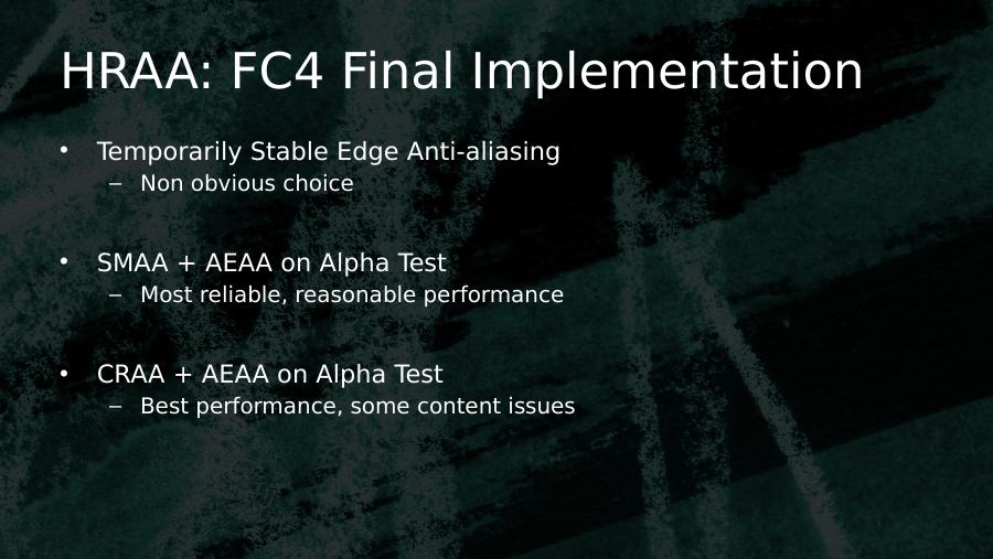 HRAA: FC4 Final Implementation• Temporarily Stable Edge Anti-aliasing– Non obvious choice• SMAA + AEAA on Alpha Test– Most reliable, reasonable performance• CRAA + AEAA on Alpha Test– Best performance, some content issues