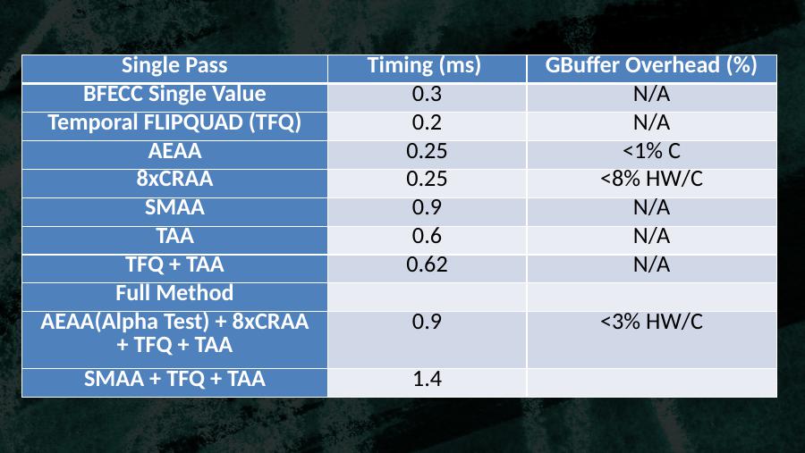 Single Pass Timing (ms) GBuffer Overhead (%)BFECC Single Value 0.3 N/ATemporal FLIPQUAD (TFQ) 0.2 N/AAEAA 0.25 <1% C8xCRAA 0.25 <8% HW/CSMAA 0.9 N/ATAA 0.6 N/ATFQ + TAA 0.62 N/AFull Method AEAA(Alpha Test) + 8xCRAA + TFQ + TAA0.9 <3% HW/CSMAA + TFQ + TAA 1.4
