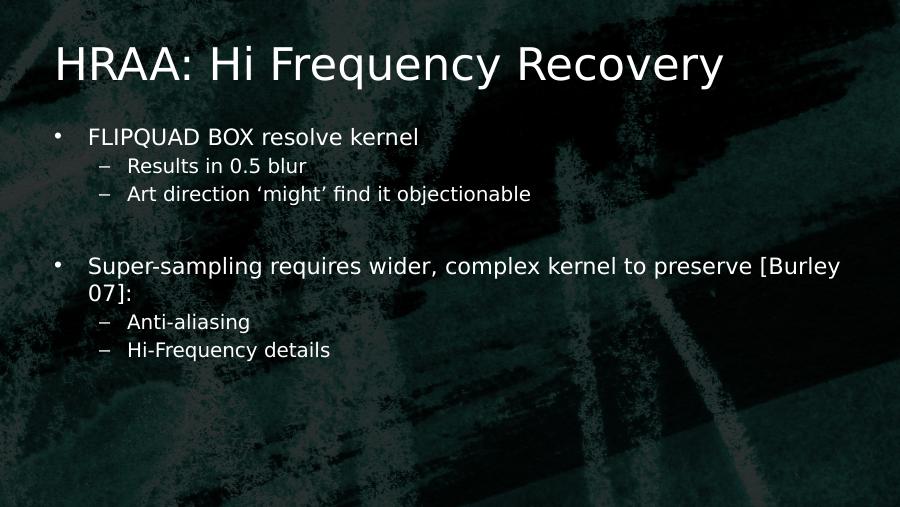 HRAA: Hi Frequency Recovery• FLIPQUAD BOX resolve kernel– Results in 0.5 blur– Art direction ‘might’ find it objectionable• Super-sampling requires wider, complex kernel to preserve [Burley 07]:– Anti-aliasing– Hi-Frequency details