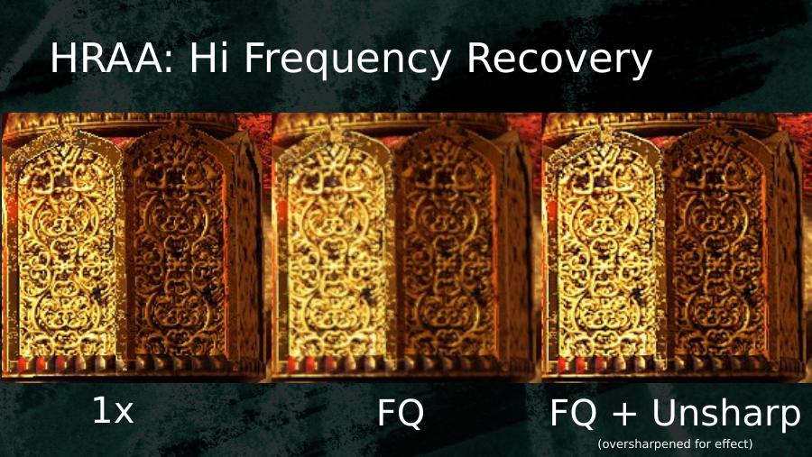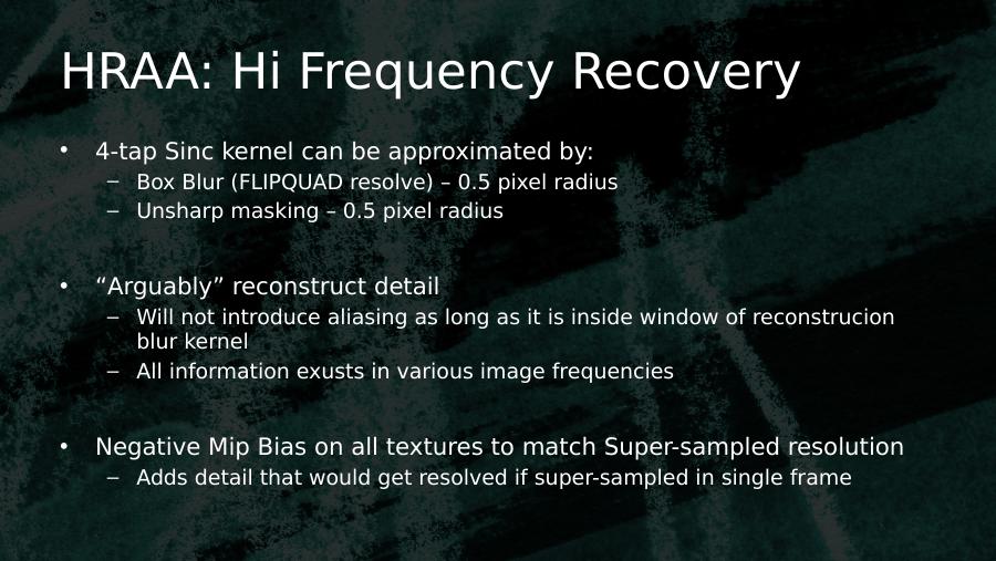 HRAA: Hi Frequency Recovery• 4-tap Sinc kernel can be approximated by:– Box Blur (FLIPQUAD resolve) – 0.5 pixel radius– Unsharp masking – 0.5 pixel radius• “Arguably” reconstruct detail– Will not introduce aliasing as long as it is inside window of reconstrucion blur kernel– All information exusts in various image frequencies• Negative Mip Bias on all textures to match Super-sampled resolution– Adds detail that would get resolved if super-sampled in single frame