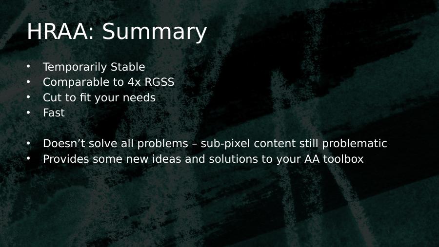 HRAA: Summary• Temporarily Stable• Comparable to 4x RGSS• Cut to fit your needs• Fast• Doesn’t solve all problems – sub-pixel content still problematic• Provides some new ideas and solutions to your AA toolbox
