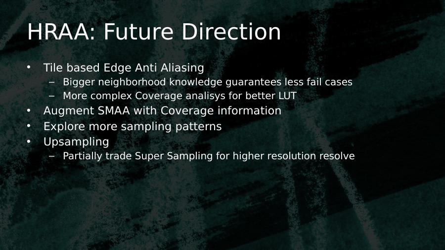 HRAA: Future Direction• Tile based Edge Anti Aliasing– Bigger neighborhood knowledge guarantees less fail cases– More complex Coverage analisys for better LUT• Augment SMAA with Coverage information• Explore more sampling patterns• Upsampling– Partially trade Super Sampling for higher resolution resolve