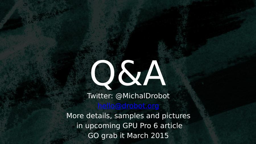 Q&ATwitter: @MichalDrobothello@drobot.orgMore details, samples and pictures in upcoming GPU Pro 6 articleGO grab it March 2015