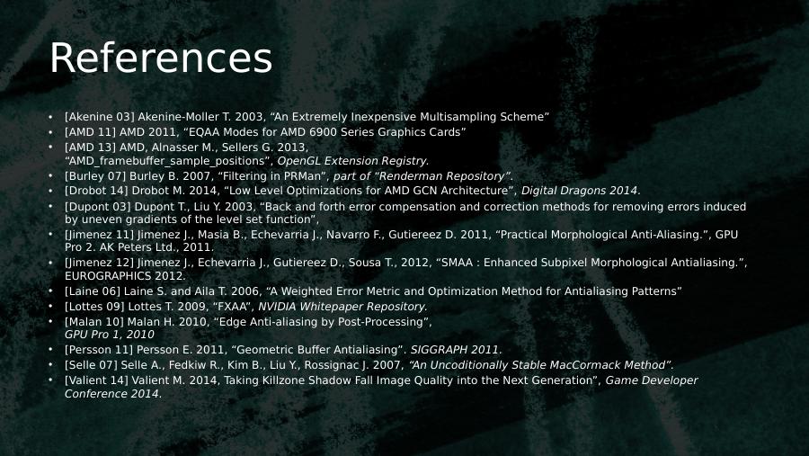 References• [Akenine 03] Akenine-Moller T. 2003, “An Extremely Inexpensive Multisampling Scheme”• [AMD 11] AMD 2011, “EQAA Modes for AMD 6900 Series Graphics Cards”• [AMD 13] AMD, Alnasser M., Sellers G. 2013, “AMD_framebuffer_sample_positions”, OpenGL Extension Registry.• [Burley 07] Burley B. 2007, “Filtering in PRMan”, part of “Renderman Repository”. • [Drobot 14] Drobot M. 2014, “Low Level Optimizations for AMD GCN Architecture”, Digital Dragons 2014. • [Dupont 03] Dupont T., Liu Y. 2003, “Back and forth error compensation and correction methods for removing errors induced by uneven gradients of the level set function”, • [Jimenez 11] Jimenez J., Masia B., Echevarria J., Navarro F., Gutiereez D. 2011, “Practical Morphological Anti-Aliasing.”, GPU Pro 2. AK Peters Ltd., 2011. • [Jimenez 12] Jimenez J., Echevarria J., Gutiereez D., Sousa T., 2012, “SMAA : Enhanced Subpixel Morphological Antialiasing.”, EUROGRAPHICS 2012.• [Laine 06] Laine S. and Aila T. 2006, “A Weighted Error Metric and Optimization Method for Antialiasing Patterns”• [Lottes 09] Lottes T. 2009, “FXAA”, NVIDIA Whitepaper Repository.• [Malan 10] Malan H. 2010, “Edge Anti-aliasing by Post-Processing”, GPU Pro 1, 2010• [Persson 11] Persson E. 2011, “Geometric Buffer Antialiasing”. SIGGRAPH 2011.• [Selle 07] Selle A., Fedkiw R., Kim B., Liu Y., Rossignac J. 2007, “An Uncoditionally Stable MacCormack Method”.• [Valient 14] Valient M. 2014, Taking Killzone Shadow Fall Image Quality into the Next Generation”, Game Developer Conference 2014.