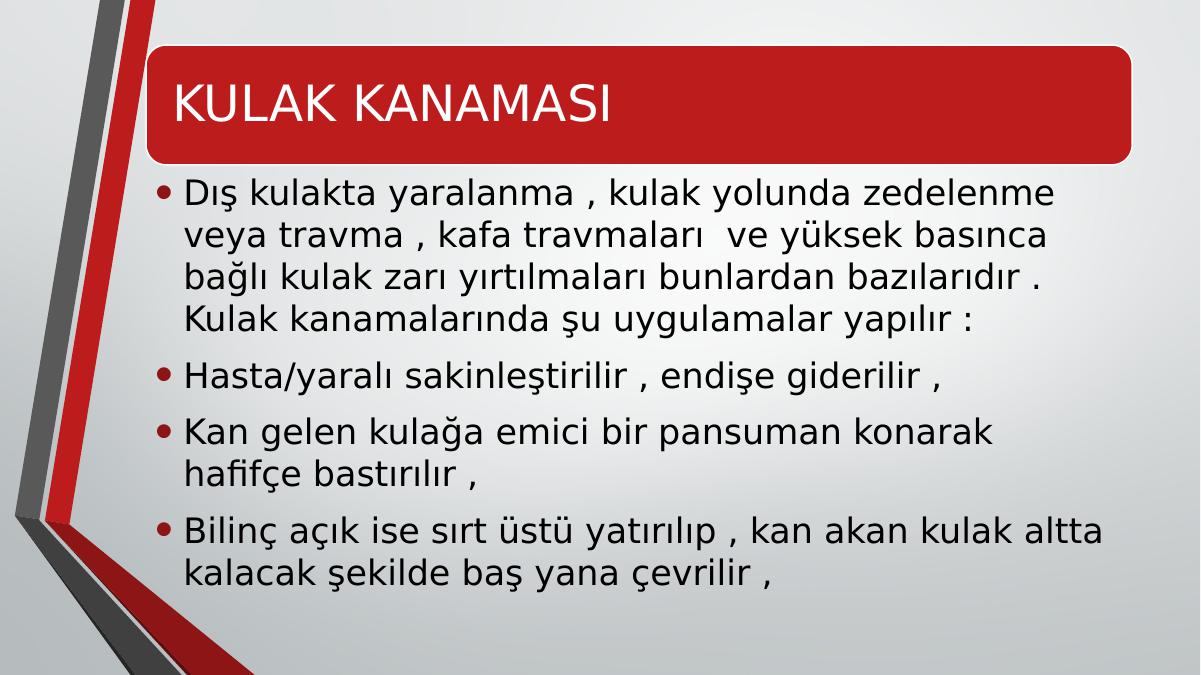 KULAK KANAMASI • Dış kulakta yaralanma , kulak yolunda zedelenme veya travma , kafa travmaları ve yüksek basınca bağlı kulak zarı yırtılmaları bunlardan bazılarıdır . Kulak kanamalarında şu uygulamalar yapılır :• Hasta/yaralı sakinleştirilir , endişe giderilir ,• Kan gelen kulağa emici bir pansuman konarak hafifçe bastırılır ,• Bilinç açık ise sırt üstü yatırılıp , kan akan kulak altta kalacak şekilde baş yana çevrilir ,