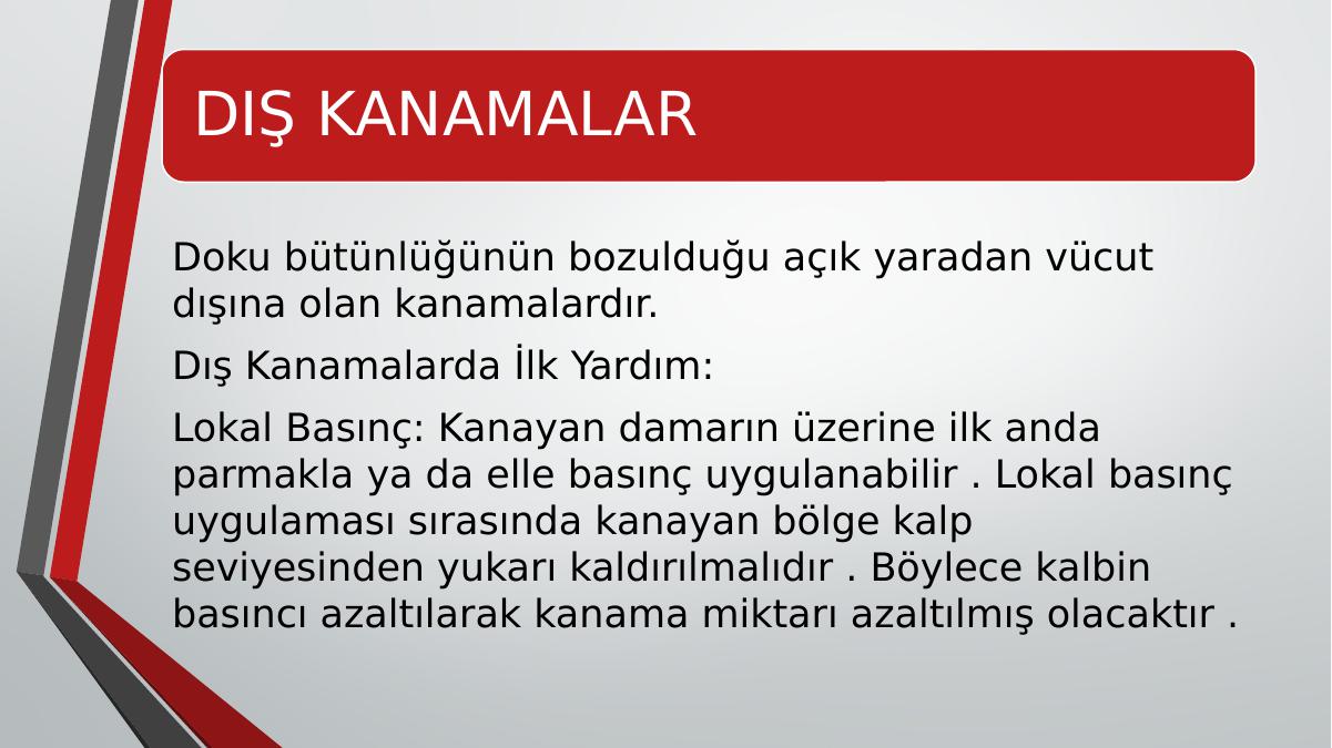 DIŞ KANAMALAR Doku bütünlüğünün bozulduğu açık yaradan vücut dışına olan kanamalardır.Dış Kanamalarda İlk Yardım:Lokal Basınç: Kanayan damarın üzerine ilk anda parmakla ya da elle basınç uygulanabilir . Lokal basınç uygulaması sırasında kanayan bölge kalp seviyesinden yukarı kaldırılmalıdır . Böylece kalbin basıncı azaltılarak kanama miktarı azaltılmış olacaktır .