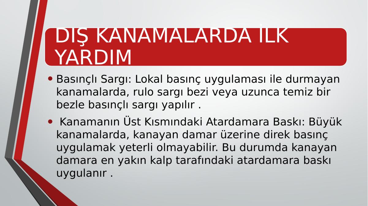 DIŞ KANAMALARDA İLK YARDIM• Basınçlı Sargı: Lokal basınç uygulaması ile durmayan kanamalarda, rulo sargı bezi veya uzunca temiz bir bezle basınçlı sargı yapılır . • Kanamanın Üst Kısmındaki Atardamara Baskı: Büyük kanamalarda, kanayan damar üzerine direk basınç uygulamak yeterli olmayabilir. Bu durumda kanayan damara en yakın kalp tarafındaki atardamara baskı uygulanır .