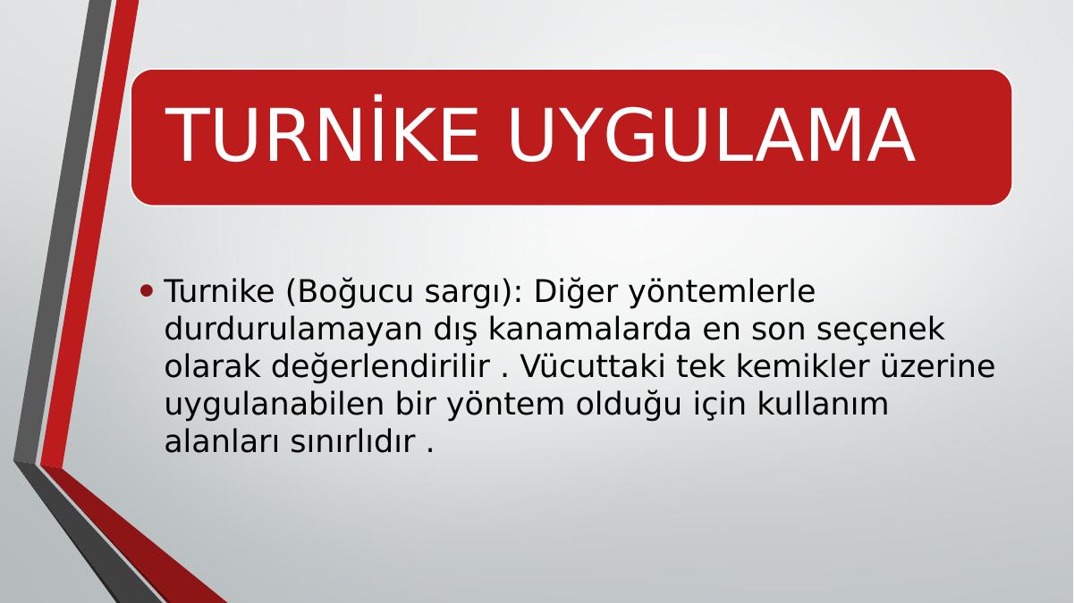 TURNİKE UYGULAMA • Turnike (Boğucu sargı): Diğer yöntemlerle durdurulamayan dış kanamalarda en son seçenek olarak değerlendirilir . Vücuttaki tek kemikler üzerine uygulanabilen bir yöntem olduğu için kullanım alanları sınırlıdır .