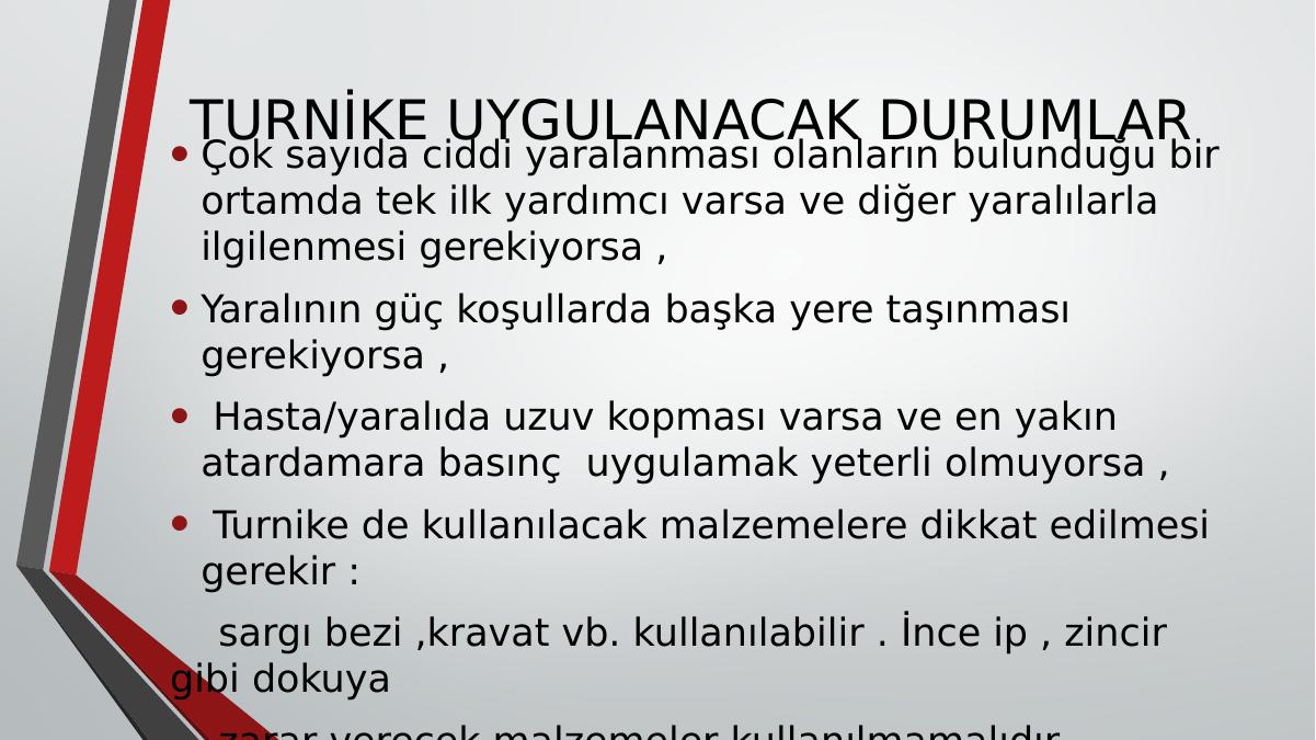 TURNİKE UYGULANACAK DURUMLAR • Çok sayıda ciddi yaralanması olanların bulunduğu bir ortamda tek ilk yardımcı varsa ve diğer yaralılarla ilgilenmesi gerekiyorsa ,• Yaralının güç koşullarda başka yere taşınması gerekiyorsa ,• Hasta/yaralıda uzuv kopması varsa ve en yakın atardamara basınç uygulamak yeterli olmuyorsa ,• Turnike de kullanılacak malzemelere dikkat edilmesi gerekir : sargı bezi ,kravat vb. kullanılabilir . İnce ip , zincir gibi dokuya zarar verecek malzemeler kullanılmamalıdır.
